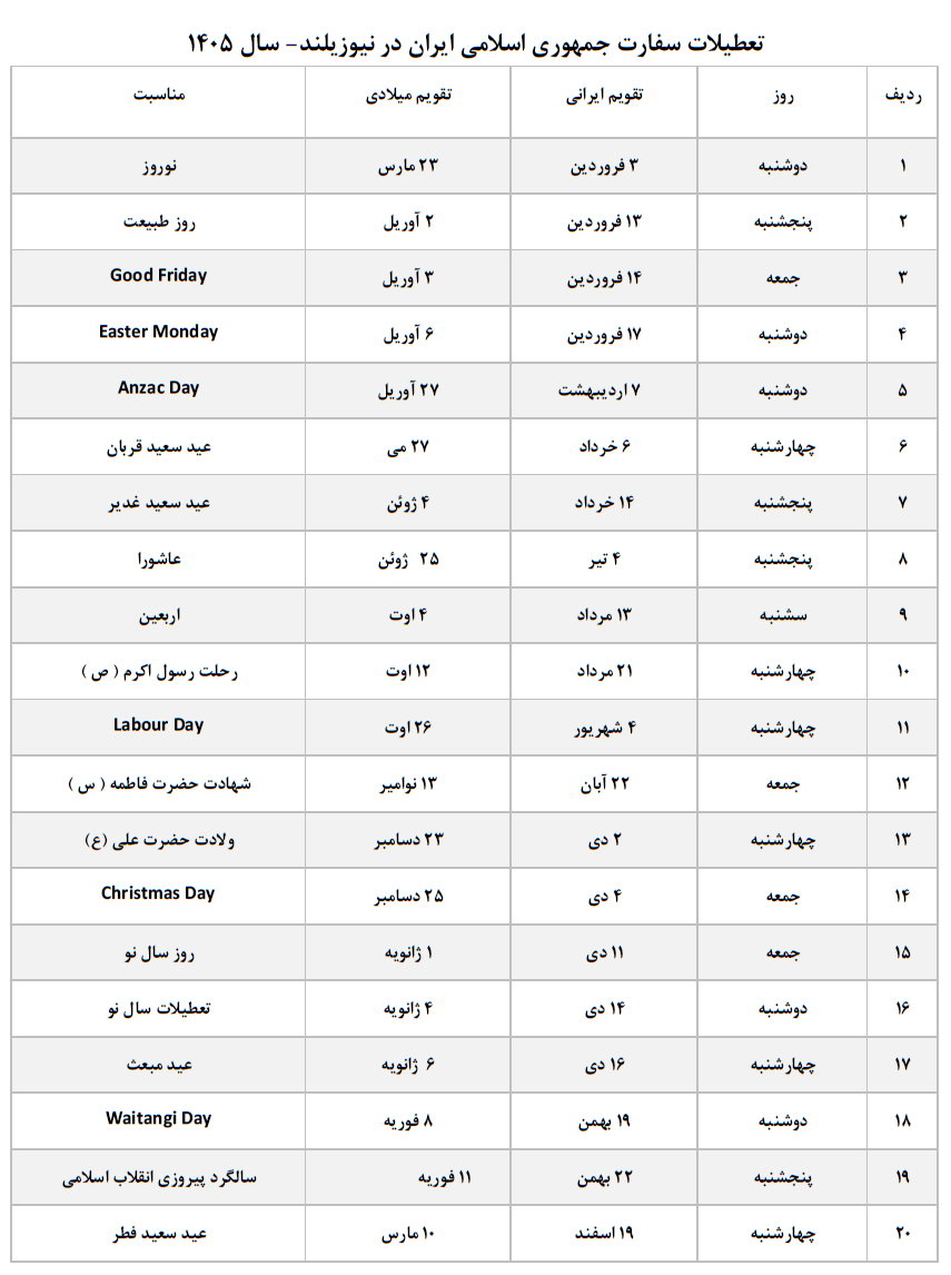 تعطیلات سفارت جمهوری اسلامی ایران در نیوزیلند در سال 1405