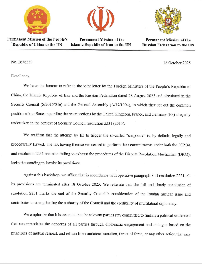 Iranian FM writes letter to counterparts denounces three European states US for reimposing terminated UN Security Council resolutions on Iran’s nucle