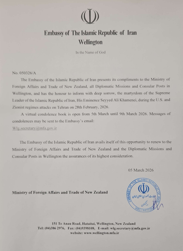 A virtual condolence book is open from 5th March until 9th March 2026. Messages of condolences may be sent to the Embassy’s email: Wlg.secretary@mfa.gov.ir
